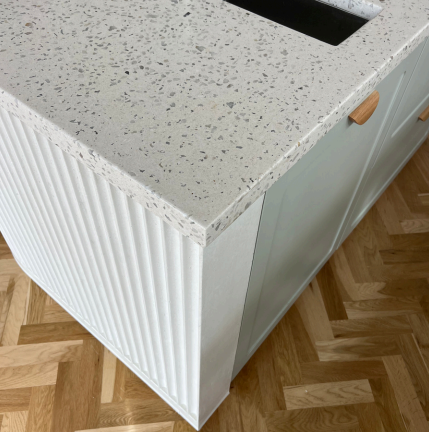 We designed a striking 5,100mm terrazzo island benchtop with a fluted concrete base, blending elegance with contemporary style.